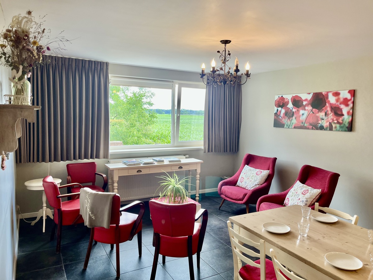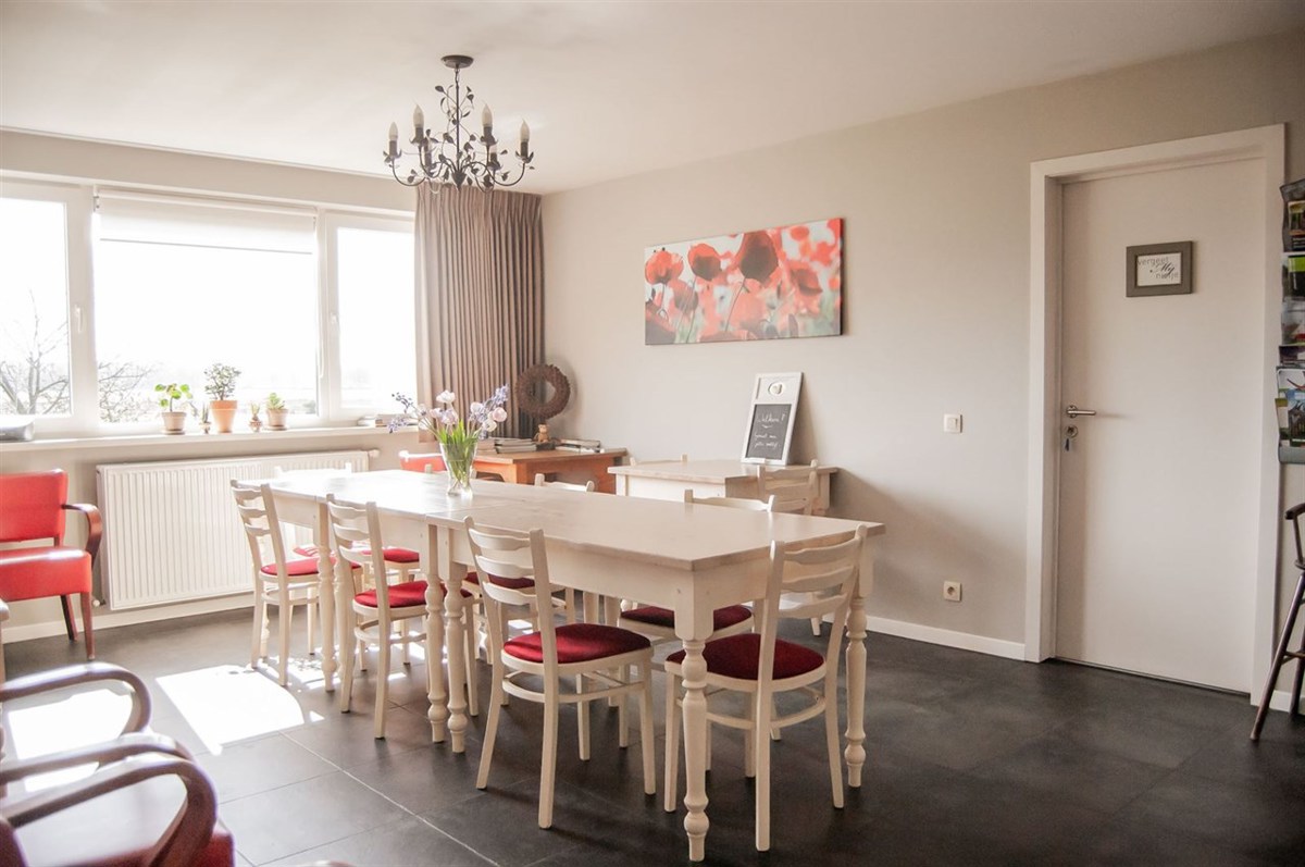 In de leefruimte vindt u een volledig uitgeruste keuken, een lange eettafel om samen te genieten en een gezellige zithoek